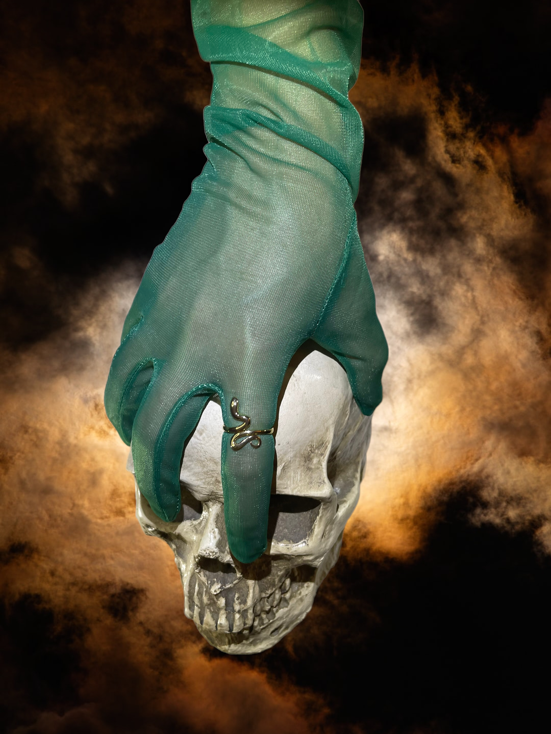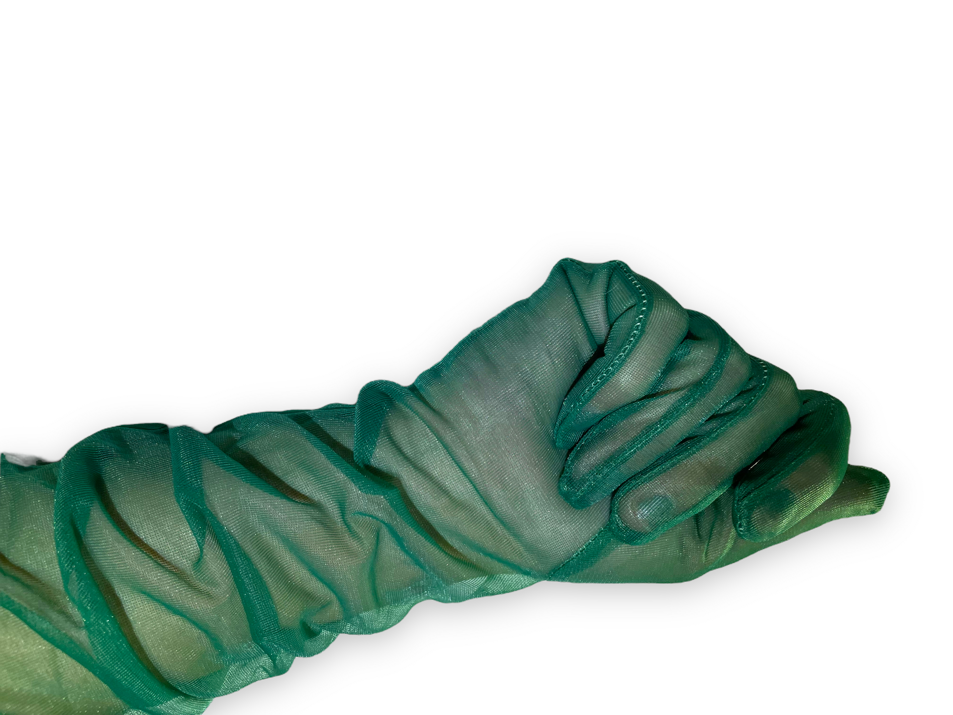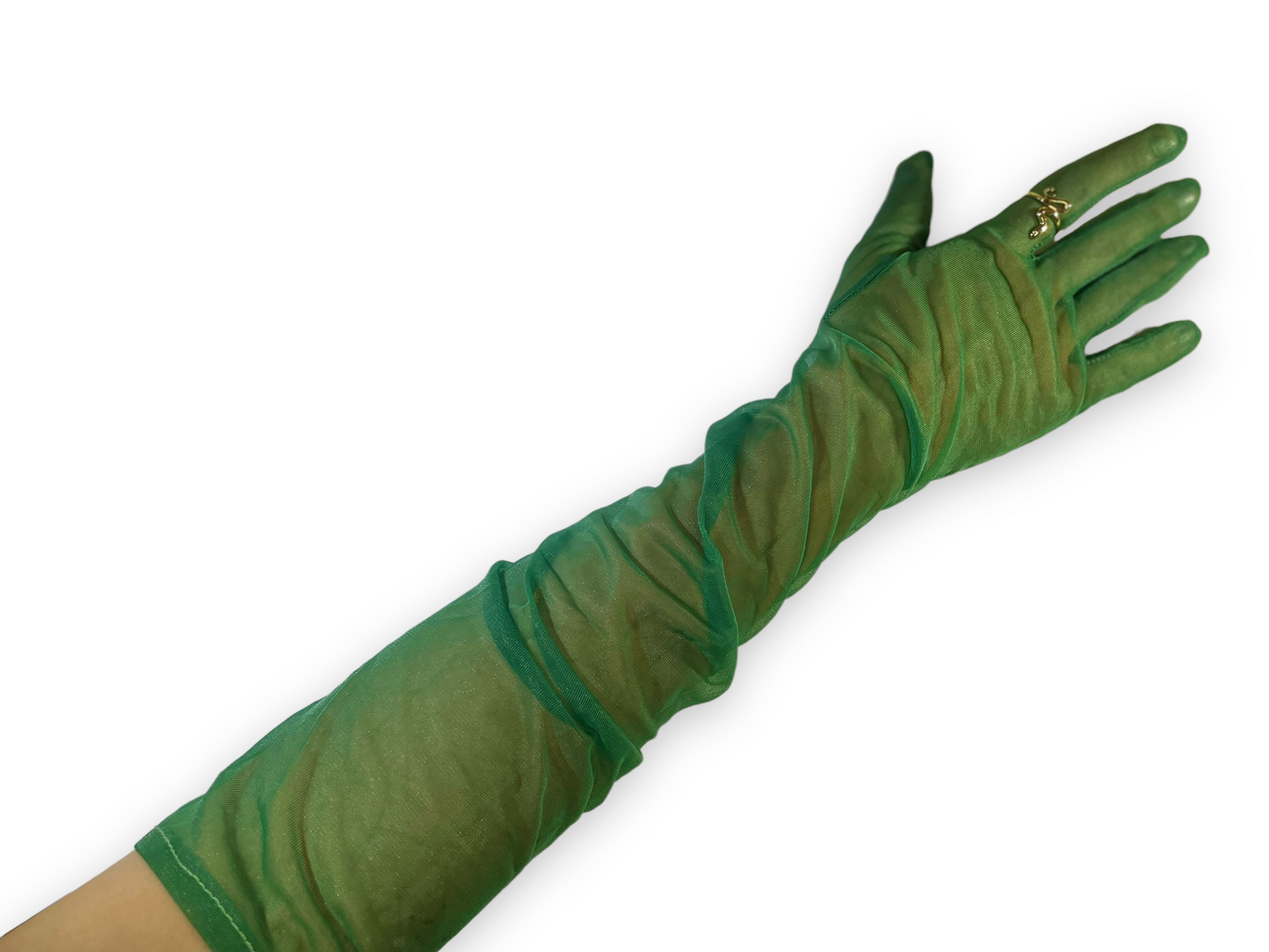 Dark green sheer opera gloves. Soft to the touch but also durable. Perfect accessory to add a little flare to your summer outfits.