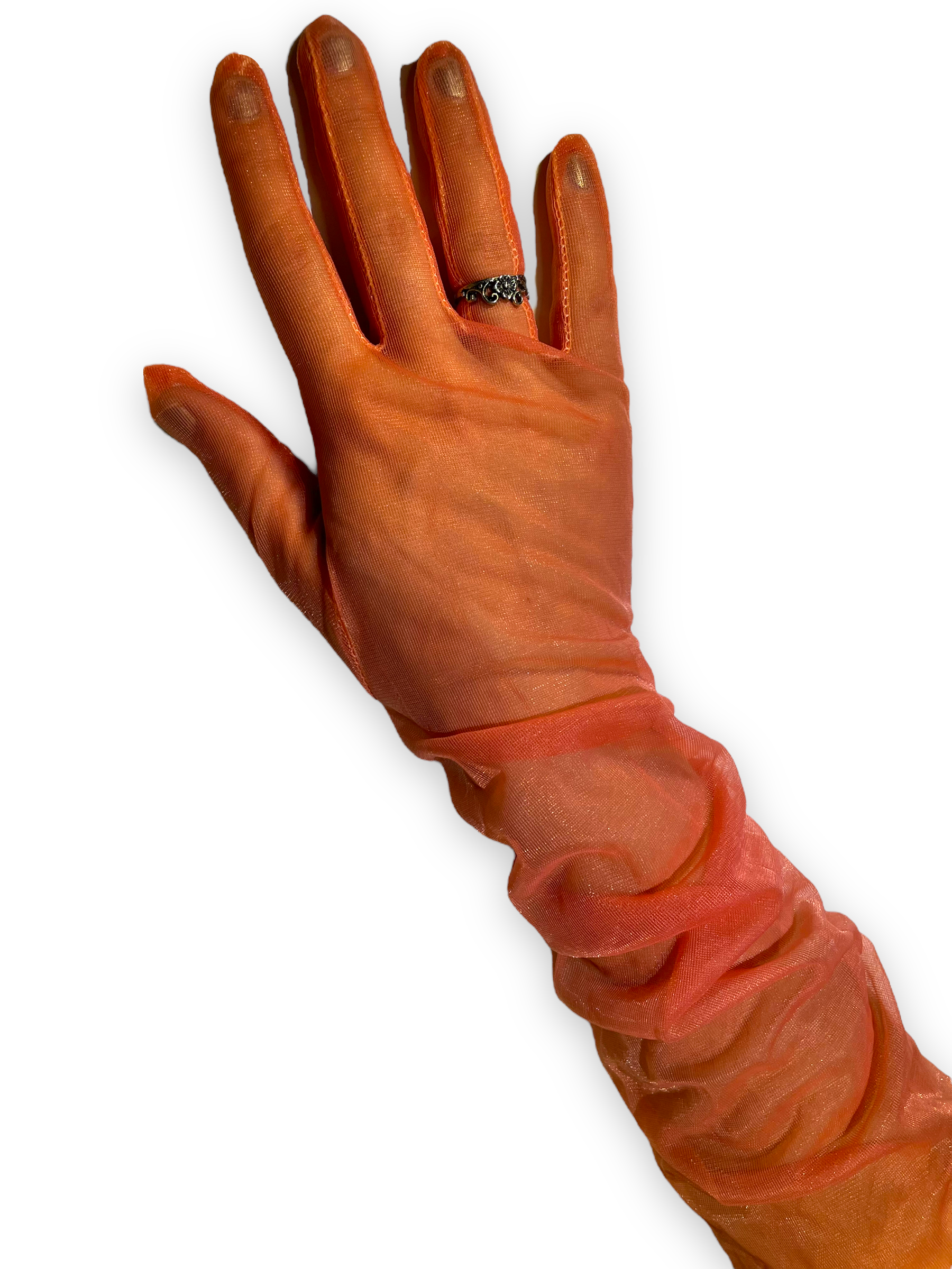 Orange mesh opera gloves. Soft to the touch but also durable. Perfect accessory to add a little flare to your summer outfits.